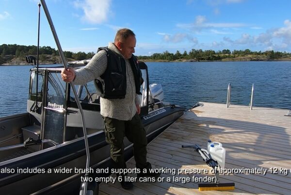 The NEW Powerbrush PRO is now in stock. PRO is the top of the line in-water boat hull brush, capable of handling up to 12 kg working pressure, and reaching hulls of boats with a beam up to 4,5 m. The functions are as earlier, but storage has been made considerably easier by dividing the handle into four parts. You can adjust the length of the handle to suit different situations and areas of use by using 2-4 parts of it, which makes the PRO even more versatile. The mount for the float is also designed so that you can use the boat’s own fenders, or 1-2 empty canisters as buoyancy. Otherwise, the features are familiar, such as the robust, optimally shaped handle made of 28 mm aluminum tube and the adjustable tool holder. The delivery includes a wide brush for all types of growth, and a nylon scraper for removing barnacles.